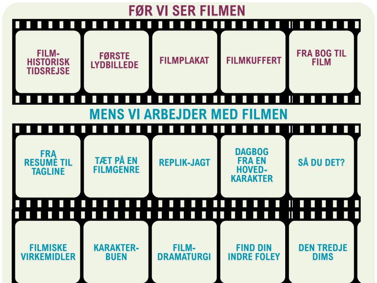 Den består af 25 konkrete greb, der giver dig redskaber til at arbejde med både spillefilm og kortfilm fra den store samling på mitCFU. Grebenes formål er at gøre filmarbejdet mere levende og varieret, så dine elever undervejs får lov til at være nysgerrige, undersøgende, legende, reflekterende og skabende.
